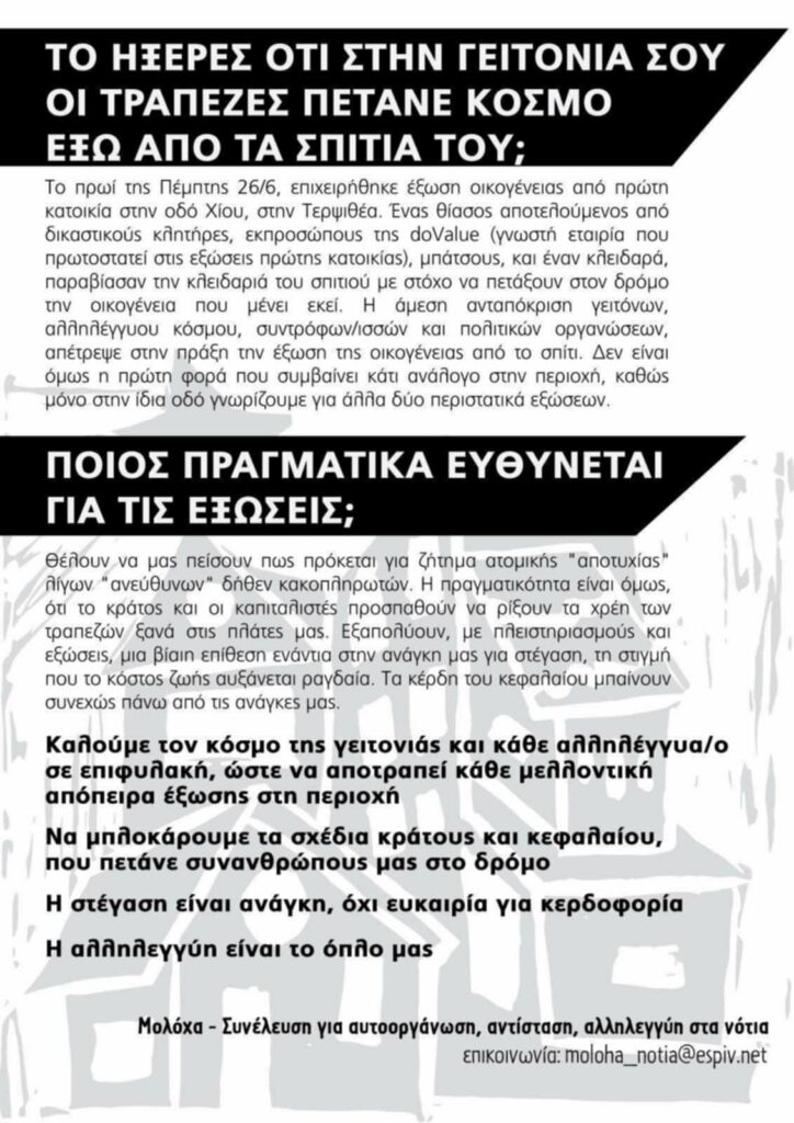 Το πρωί της Πέµπτης 26/6, επιχειρήθηκε έξωση οικογένειας από πρώτη κατοικία στην οδό Χίου στην Τερψιθέα. Ένας θίασος αποτελούμενος από δικαστικούς κλητήρες, εκπροσώπους της doValue (γνωστή εταιρία που πρωτοστατεί στις εξώσεις πρώτης κατοικίας), µπάτσους, και έναν κλειδαρά, παραβίασαν την κλειδαριά του σπιτιού µε στόχο να πετάξουν στον δρόµο την οικογένεια που µένει εκεί. Η άμεση ανταπόκριση γειτόνων, αλληλέγγυου κόσµου, συντρόφων/ισσών και πολιτικών οργανώσεων, απέτρεψε στην πράξη την έξωση της οικογένειας από το σπίτι. ∆εν είναι η πρώτη φορά που συμβαίνει κάτι ανάλογο στην περιοχή, µόνο στην ίδια οδό γνωρίζουµε για άλλα δύο περιστατικά εξώσεων.