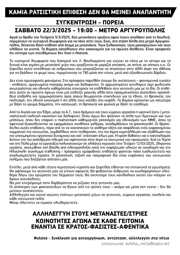 Αργά το βράδυ της Τετάρτης 5/3/2025, δύο µετανάστες εργάτες αφού έχουν σχολάσει από τη δουλειά, περιµένουν το νυχτερινό λεωφορείο για να πάνε σπίτι τους. Εκεί, στη στάση δίπλα στο µετρό Αργυρού- πολης, δέχονται βίαιη επίθεση από άτοµα µε µηχανάκια. Τους ξυλοκοπούν, τους µαχαιρώνουν και τους κλέβουν τα κινητά. Τα θύµατα καταλήγουν στο νοσοκοµείο για τις πρώτες βοήθειες. Είναι προφανές ότι κίνητρο των επιτιθέµενων δεν ήταν η ληστεία.