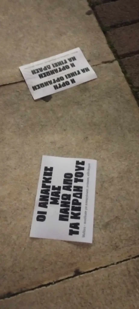Κείμενο που μοιράστηκε και αφίσα που κολλήθηκε στην περιοχή της Τερψιθέας (Γλυφάδα), με αφορμή περιστάτικά εξώσεων στην γειτονιά.