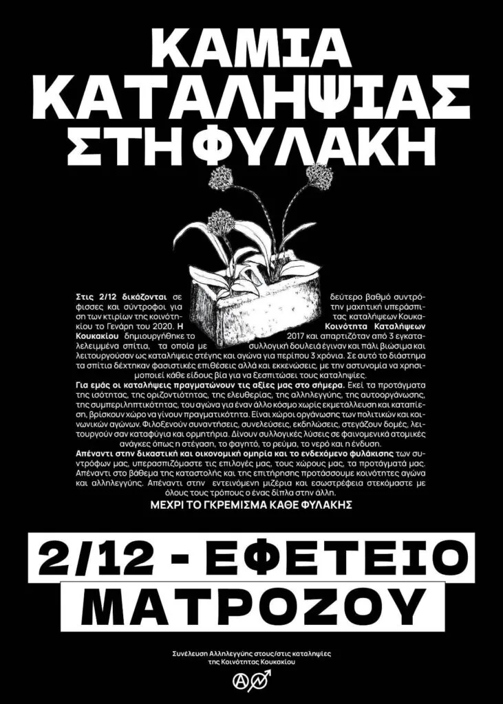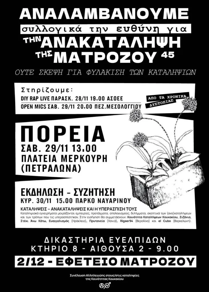 Αλληλεγγύη σε όσα διώκονται για την εκκένωση της (ανα)κατάληψης Ματρόζου 45 στο Κουκάκι