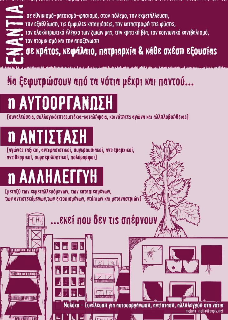 Να ξεφυτρώσουν από τα νότια μέχρι και παντού… η ΑΥΤΟΟΡΓΑΝΩΣΗ [συνελεύσεις, συλλογικότητες, στέκια-καταλήψεις, κοινότητες αγώνα και αλληλοβοήθειας] η ΑΝΤΙΣΤΑΣΗ [αγώνες ταξικοί, αντιφασιστικοί, συγκρουσιακοί, αντιεραρχικοί, αντιθεσμικοί, συμπεριληπτικοί, πολύμορφοι] η ΑΛΛΗΛΕΓΓΥΗ [μεταξύ των εκμεταλλευόμενων, των καταπιεσμένων, των αντιστεκόμενων,των εκτοπισμένων, ντόπιων και μεταναστριών] …εκεί που δεν τις σπέρνουν