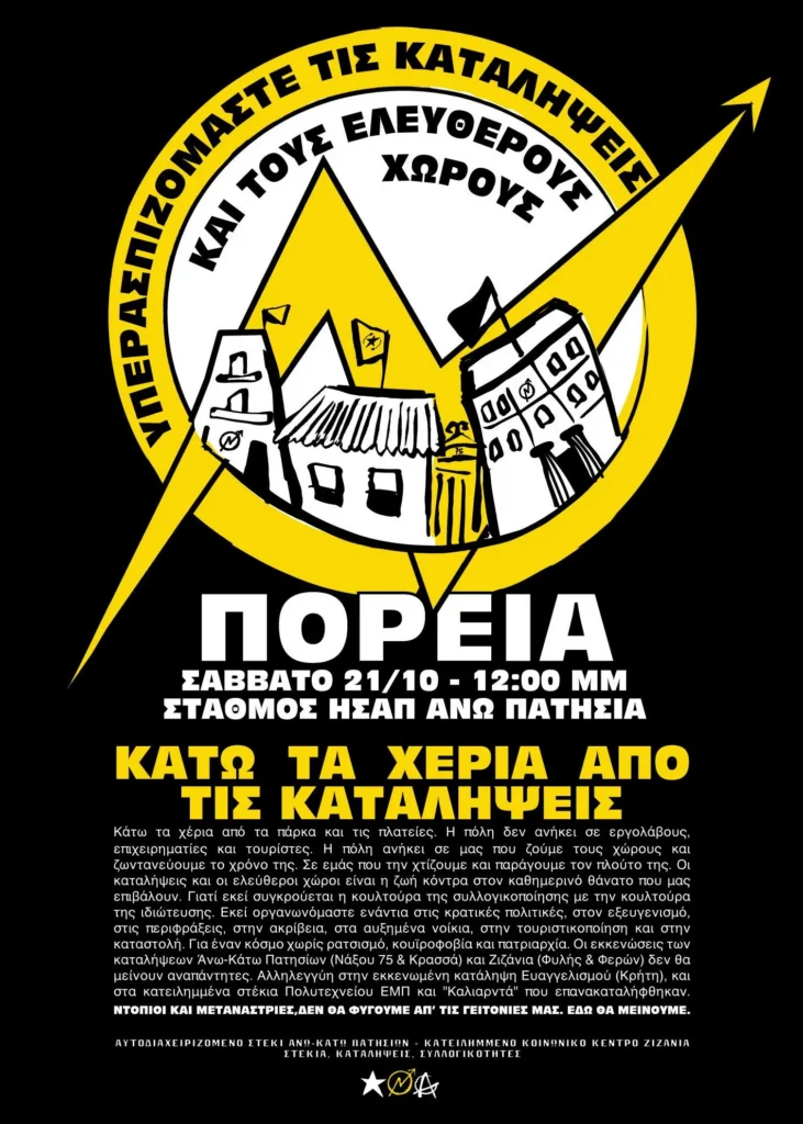 Κάτω τα χέρια από τις καταλήψεις. Κάτω τα χέρια από τα πάρκα και τις πλατείες. Η πόλη δεν ανήκει σε εργολάβους, επιχειρηματίες και τουρίστες. Η πόλη ανήκει σε μας που ζούμε τους χώρους και ζωντανεύουμε το χρόνο της. Σε εμάς που την χτίζουμε και παράγουμε τον πλούτο της.