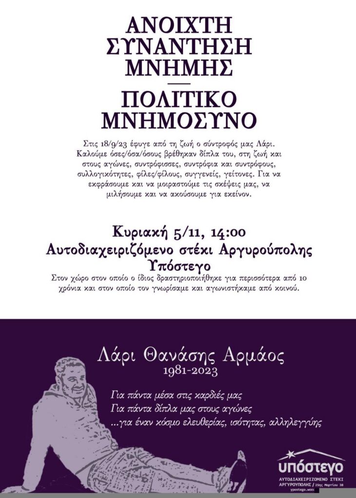 Σε πείσμα των καιρών και παρά τις δυσμενείς συνθήκες που καλούμαστε να αντιμετωπίζουμε καθημερινά, θεωρούμε μονόδρομο το δυνάμωμα των συλλογικών αγώνων, με οριζόντιο χαρακτήρα που δημιουργούν ρήγματα και απειλές για την κυριαρχία και συμβάλλουν στην ικανοποίηση των αναγκών μας. Σε αυτή την κατεύθυνση, είναι αναγκαία η παρουσία μας στον δρόμο και εν γένει στον δημόσιο χώρο. Μόνο έτσι μπορούμε να αναδείξουμε ό,τι θέλουν να μείνει στην αφάνεια και να ταράξουμε τα νερά της “εύρυθμης” καθημερινότητας που αφήνει χώρο μόνο για εργασία και κατανάλωση. Αναπόσπαστο κομμάτι των συλλογικών μας αντιστάσεων και ισχυρό όπλο ενάντια στις διώξεις που βιώνουμε, είναι η έμπρακτη αλληλεγγύη που αποτελεί ανάχωμα στον φόβο και την ηττοπάθεια. Δεν πρέπει να ξεχνάμε πως σε αυτές τις δύσκολες καταστάσεις, το μόνο που έχουμε είναι ο ένας την άλλη. Όλοι/ες/α στα δικαστήρια της Ευελπίδων, την Πέμπτη 7/11/2024.