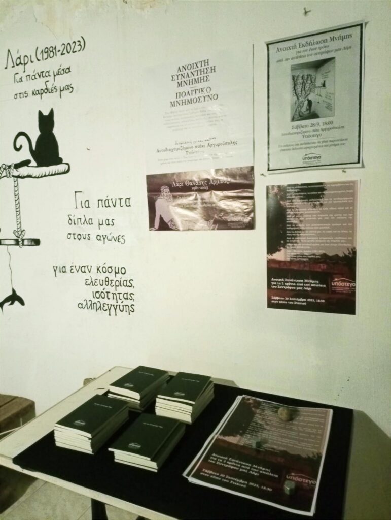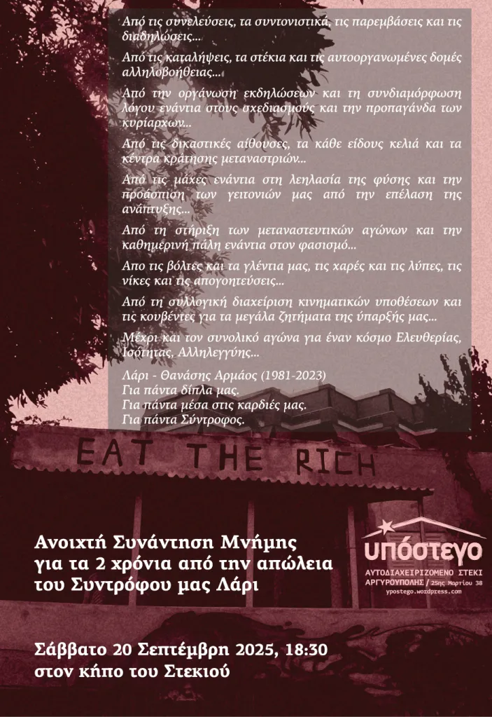 Μαζευτήκαμε σήμερα εδώ, στο Υπόστεγο, για μια ακόμη φορά, στη μνήμη του συντρόφου μας Λάρι που χάθηκε στις 18 Σεπτέμβρη του 2023. Δεν έχουμε να πούμε πολλά νέα πράγματα από πλευρά μας, πέρα από όσα έχουμε ήδη πει και όσα καταγράψαμε στην διάρκεια αυτών των δύο χρόνων… Δεν θέλαμε να γράψουμε και δεν γράψαμε μία νέα ολοκληρωμένη εισήγηση για σήμερα… Δεν είχαμε κάποιον συγκεκριμένο σκοπό κατά νου με τη διοργάνωση αυτής της συνάντησης, πέραν του να βρεθούμε όσοι και όσες είχαμε την τύχη να γνωρίσουμε τον Λάρι, ώστε να ελαφρύνει λίγο ο πόνος της απώλειας, και να αντιμετωπίσουμε την απουσία του συλλογικά. Όπως τότε, τις πρώτες μέρες μετά τον θάνατό του, έτσι και τώρα, ο μόνος τρόπος που μπορούμε ως Υπόστεγο να διαχειριστούμε την σκληρή απώλεια ενός* συντρόφου είναι να ανταμώσουμε, να σταθούμε κοντά ο ένας στην άλλη, να μιλήσουμε, να ακούσουμε, να γελάσουμε, να κλάψουμε και να απαλύνουμε τον πόνο μας… Να νιώσουμε ότι ο Λάρι βρίσκεται κοντά μας… Να μην ξεχάσουμε τις λεπτομέρειες του προσώπου του, τη φωνή του, το γέλιο του, τις τοποθετήσεις του… Να τις ξαναθυμηθούμε, και να τις υπενθυμίζουμε όσα χρόνια και αν περάσουν, ώστε να μείνει ζωντανός στις μνήμες και τις καρδιές μας… Να μοιραστούμε ξανά ιστορίες, τόσο από τις νίκες και τις χαρές, όσο και από τις ήττες και τις λύπες που ζήσαμε μαζί του… Να απαριθμήσουμε ξανά το πόσα πράγματα μάς έμαθε στη θεωρία και στην πράξη, το πόσες αξίες μάς μετέδωσε… Να υπενθυμίσουμε στους εαυτούς και στις εαυτές μας το πόσο ακέραια είχε επιλέξει να στέκεται ως πολιτικό υποκείμενο, δίπλα σε μας αλλά και σε κάθε κατατρεγμένο άτομο, από τις φυλακές και τα κέντρα κράτησης μέχρι τις πορείες και τα δικαστήρια… Να εκτιμάμε εκ νέου, κάθε χρόνο και λίγο παραπάνω, τη συμβολή του στο κίνημα και στους αγώνες, όχι μόνο σε ότι αφορά το Υπόστεγο, αλλά και ευρύτερα… Είναι τόσο πολλές οι διαδηλώσεις, οι δράσεις, οι συνελεύσεις, οι διαχειριστικές, τα συντονιστικά, τα γλέντια και οι εκδηλώσεις που συναντηθήκαμε ή διοργανώσαμε από κοινού όλα αυτά τα χρόνια, που καταλήγουν να συνθέτουν μία διαδρομή, συνυφασμένη με την ιστορία και το παρελθόν του Υποστέγου από την πρώτη μέρα… Ό,τι συνέλευση ή δομή συνεχίζει να υπάρχει στο Υπόστεγο μέχρι σήμερα, αλλά και ο χώρος ο ίδιος, οφείλουν σε μεγάλο βαθμό την ύπαρξη και την άνθισή τους στην πολύτιμη συμβολή του Λάρι…